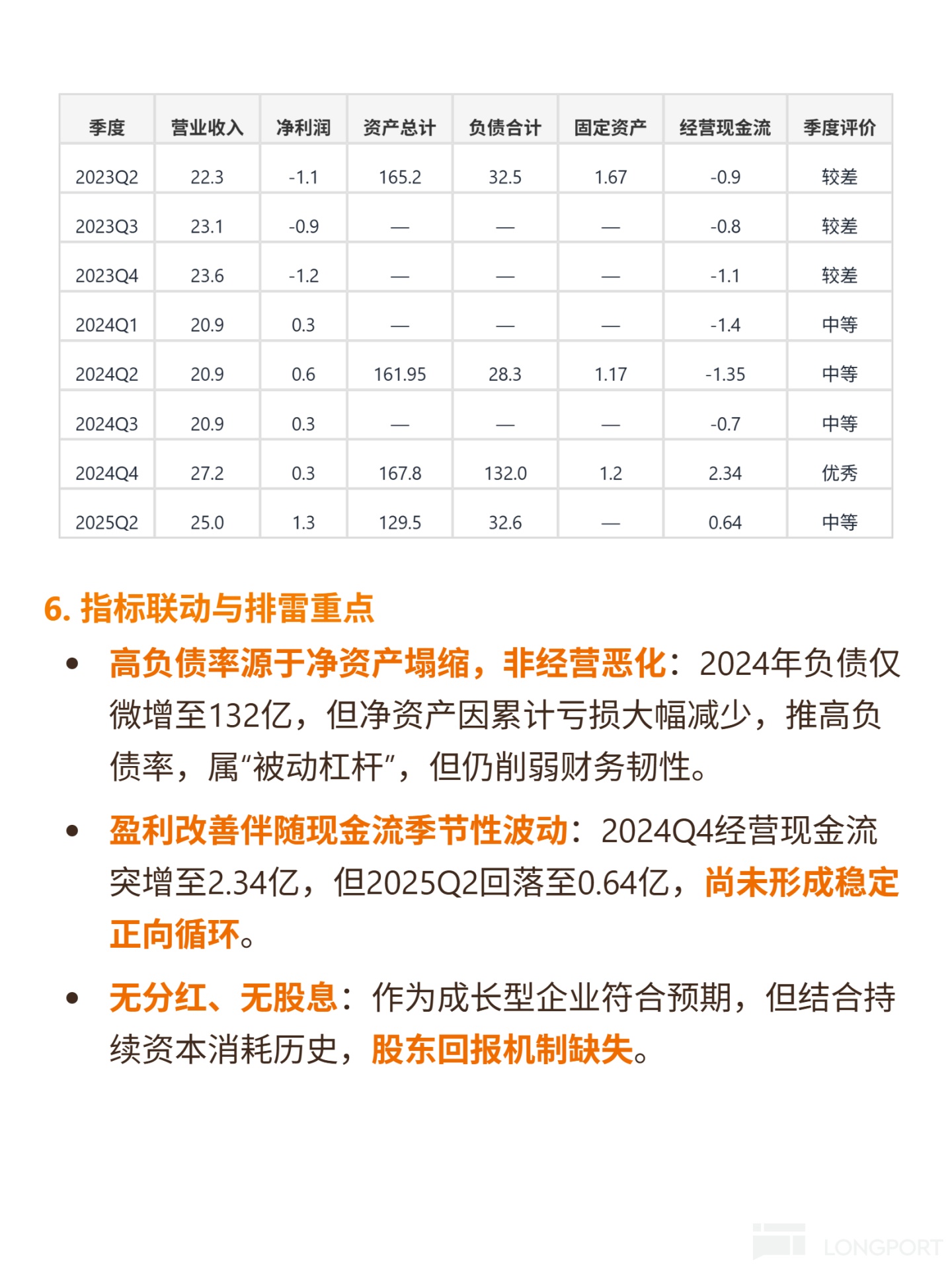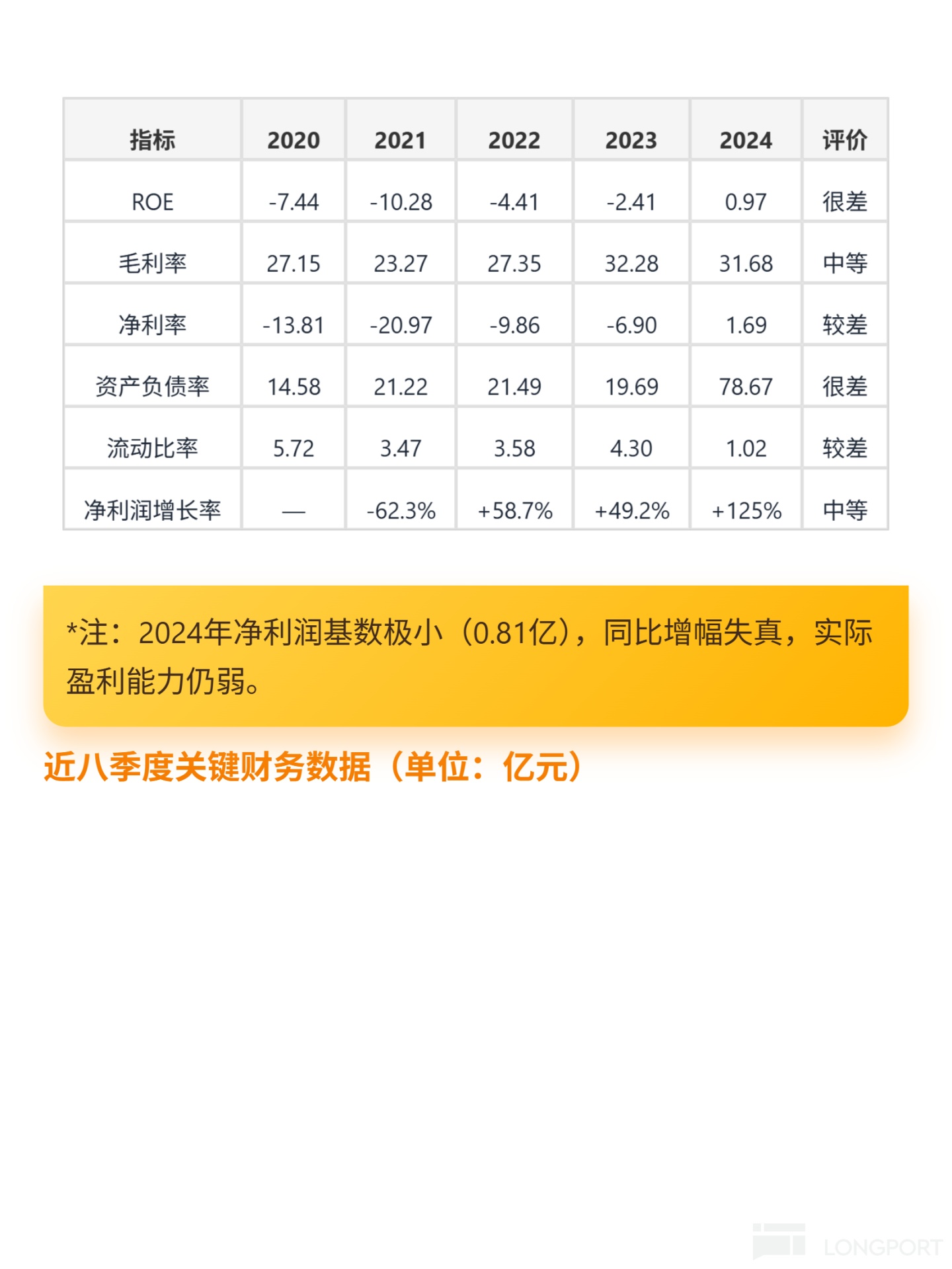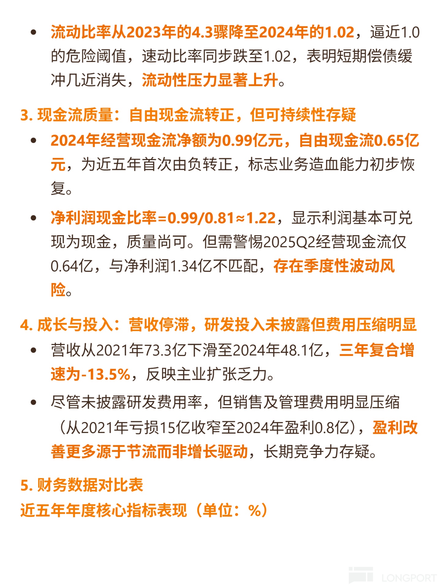 📈 Financial highlights: First marginal profit in 2024 (net margin of 1.69%), ROE turned positive to 0.97%, operating cash flow (¥99 million) and free cash flow (¥65 million) turned positive for the first time in nearly five years. However, three-year revenue CAGR was -13.5% (2021-2024), with profit improvement driven by cost-cutting. The debt-to-asset ratio surged to 78.67%, and the current ratio is close to 1 (1.02), indicating significant short-term liquidity pressure.