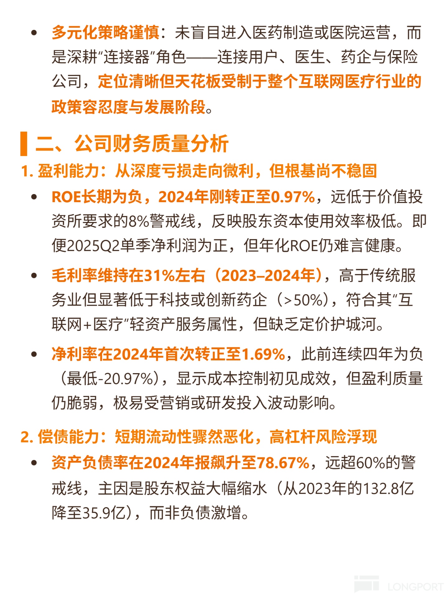 $PA GOODDOCTOR(01833.HK)$JD HEALTH(06618.HK) $ALI HEALTH(00241.HK)Research on Ping An Good Doctor reveals that the biggest takeaway is: an internet healthcare platform reliant on group synergies, which has just achieved marginal profitability but has weak financial foundations, with long-term value constrained by industry policies and monetization efficiency.