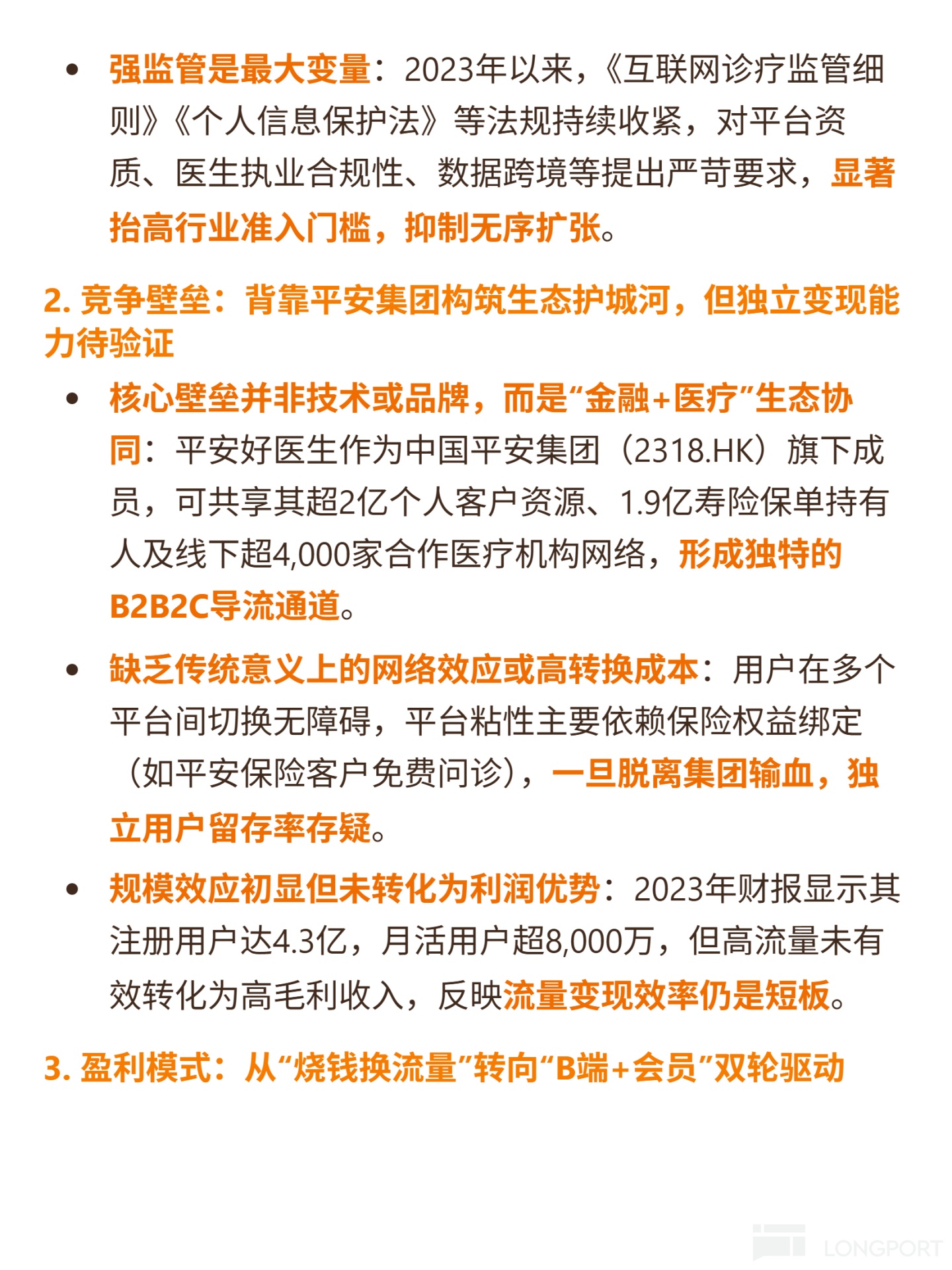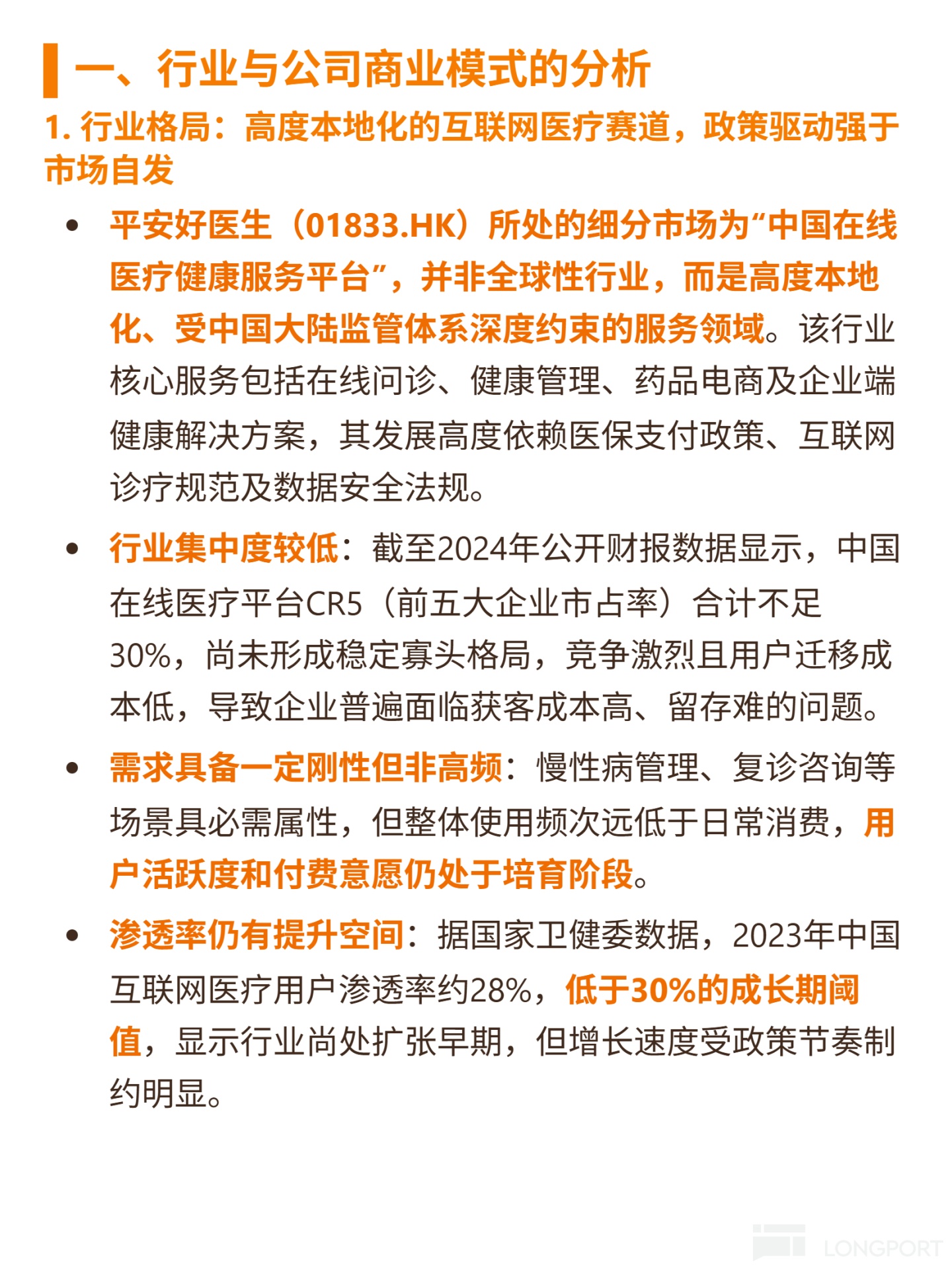 🎯 Core logic: Ping An Good Doctor is an online healthcare service platform under Ping An Group, positioned as a "connector" (connecting users, doctors, pharmaceutical companies, and insurers). New users mainly come from group life insurance and bank referrals, with 99% of revenue from mainland China. Growth is constrained by industry policies and its own monetization efficiency.