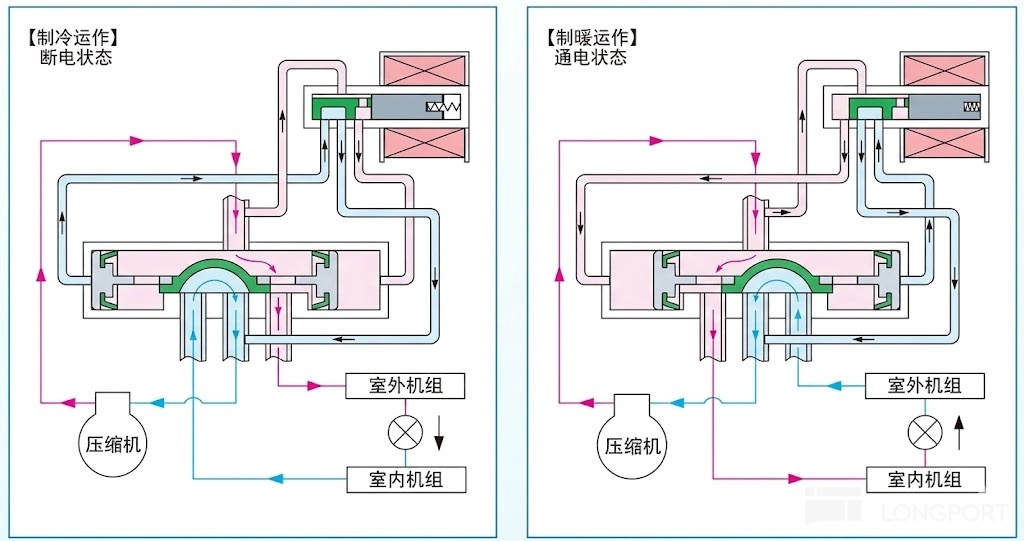 Take the four-way valve as an example: it has four ports and, via spool movement, reroutes refrigerant paths as shown. Figure: Four-way valve working principle