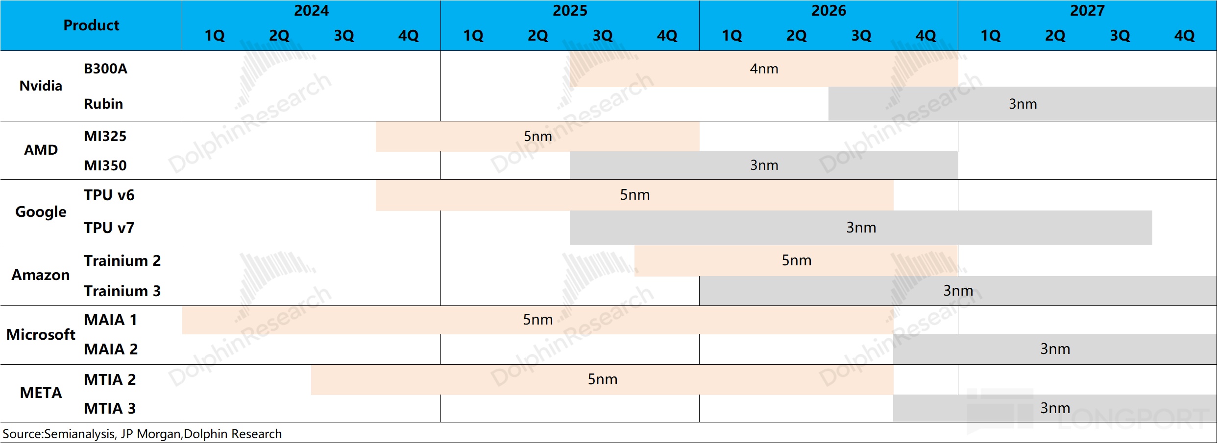 b) 2nm progress and node migration: 2nm will ramp to volume in 2026, with parts of Apple and Qualcomm smartphone demand migrating to 2nm. In parallel, AI chips will broadly upgrade to 3nm, where Rubin, MI350 and Google TPUv7 are set to use TSMC's 3nm.
