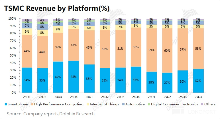 HPC remained the largest contributor at 55% of revenue. Supported by Nvidia's GB-series AI chips, HPC revenue was about $18.55bn and edged down QoQ. Q3–Q4 are peak seasons for smartphones and related devices, so TSMC tilted more shipments to iPhone and other handset customers.