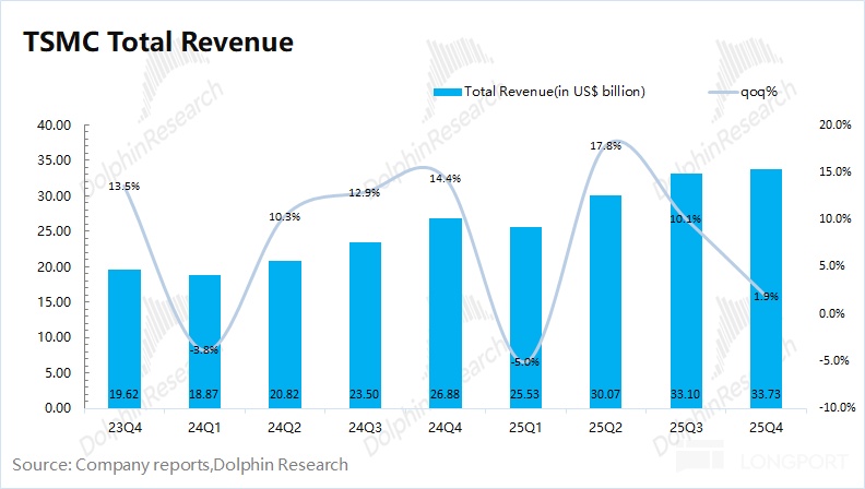 1) Revenue: Q4 revenue was $33.7bn, up 1.9% QoQ, driven by new iPhone shipments and stronger AI chip demand. Despite a stronger USD, revenue topped the high end of guidance ($32.2–33.4bn). In TWD terms, revenue rose 5.7% QoQ, well above the high end of guidance (+1% QoQ).
