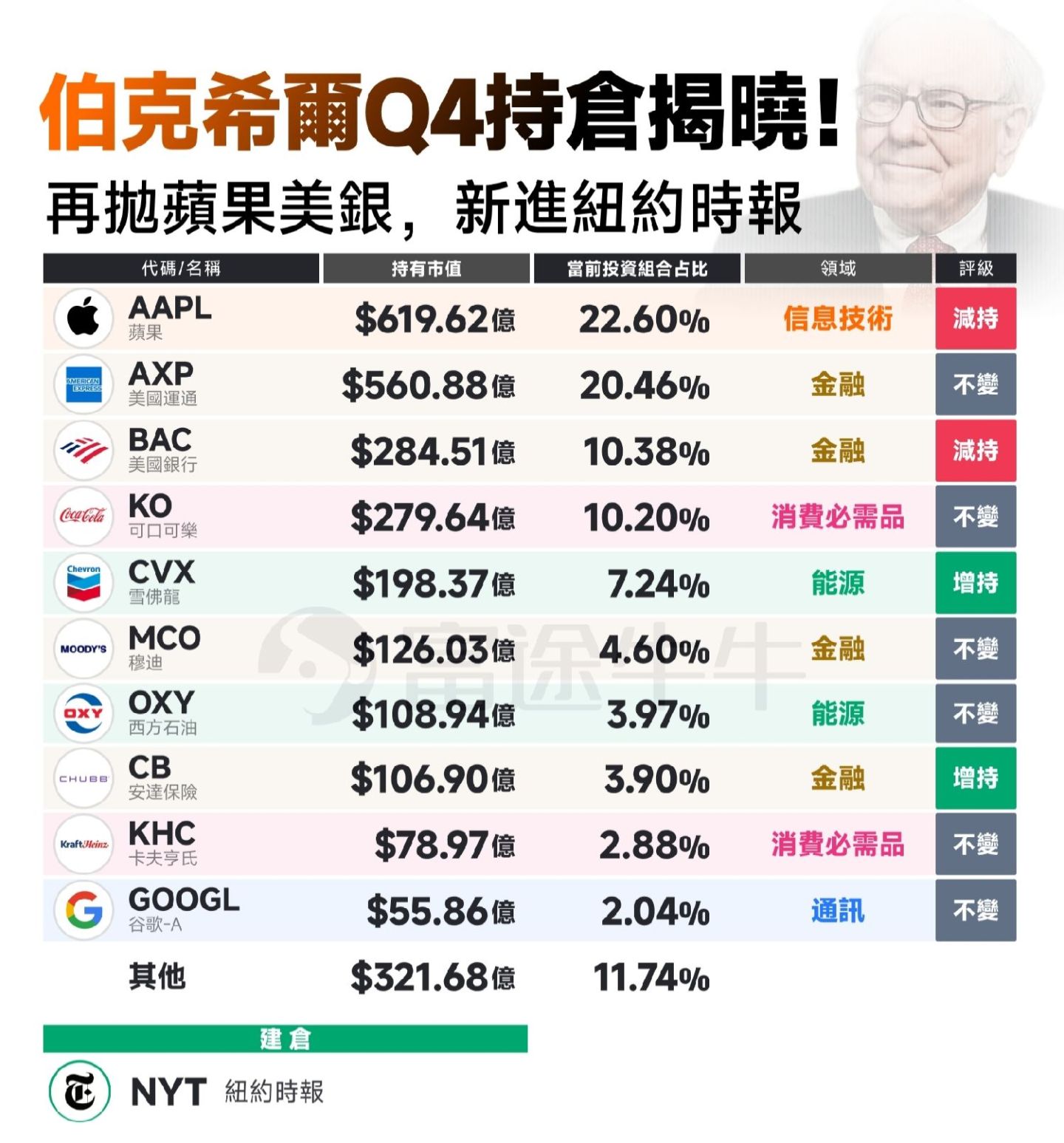 After U.S. markets closed on February 17th Eastern Time, the 13F filing submitted by Berkshire Hathaway to the U.S. Securities and Exchange Commission (SEC) showed that $Berkshire Hathaway Inc. (BRK.B.US)$ continued to adjust its holdings in tech giants in the fourth quarter of 2025, selling off Amazon significantly while continuing to reduce its stakes in Apple and Bank of America, and making its first investment in the traditional media company The New York Times. The filing revealed that by the end of the fourth quarter of last year, Berkshire's overall portfolio size was $274 billion, an increase of approximately $7 billion from the $267 billion in the third quarter.