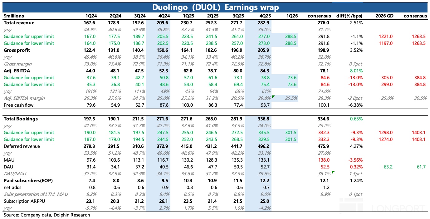 $Duolingo(DUOL.US) released Q4 FY2025 results after-hours on Feb 26 (ET). Once again, guidance bombed.