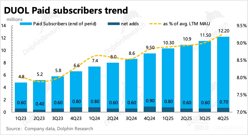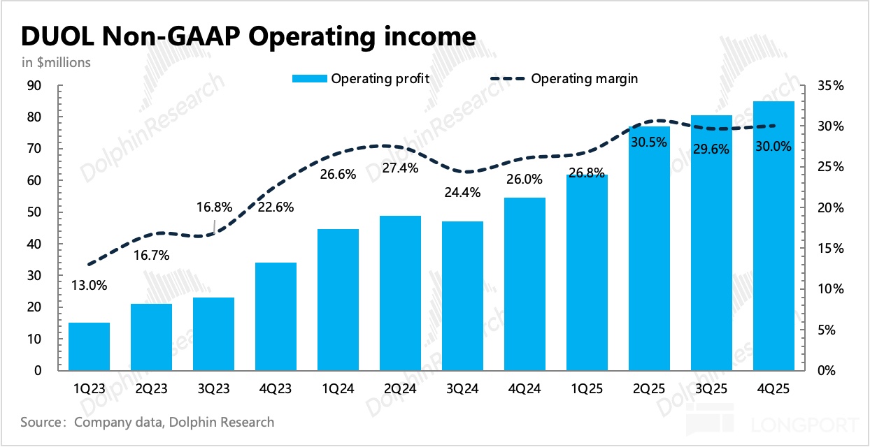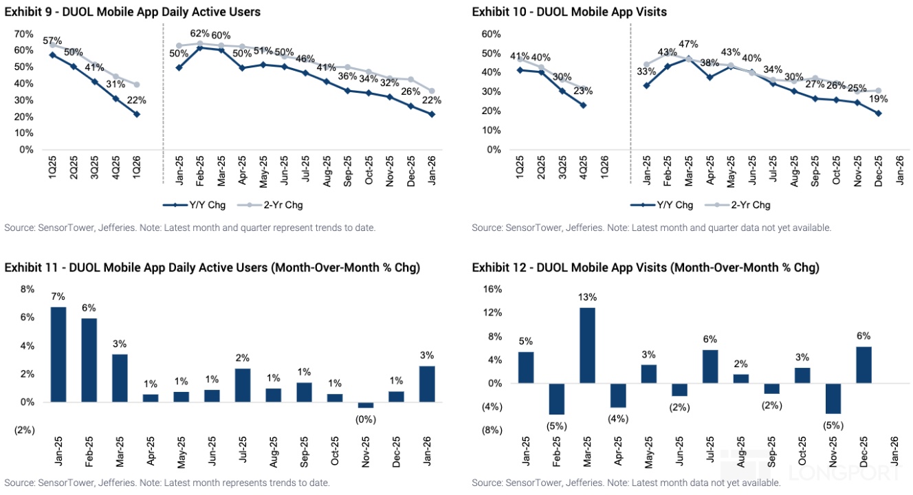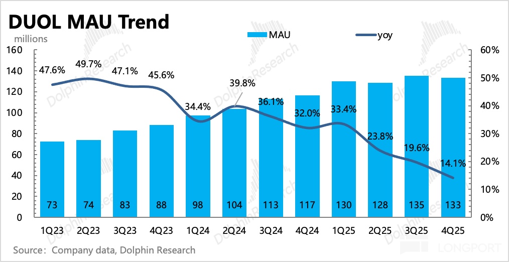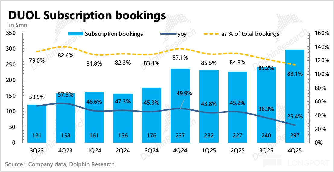 Per Sensor Tower, growth issues were concentrated in North America and LatAm; in Jan, Duolingo ramped up marketing and ads, largely stabilizing the decline. However, with last year’s 'Dead Duo' campaign ending, Dolphin Research expects Q1 growth to continue slowing overall.