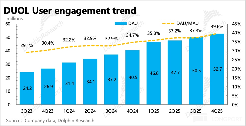 Compared with true utility translation tools, Duolingo still enjoys high stickiness. Q4 DAU/MAU improved to 39%, a high level for any internet platform. If Duolingo can enhance UX through this transition, that could be the key to a comeback.