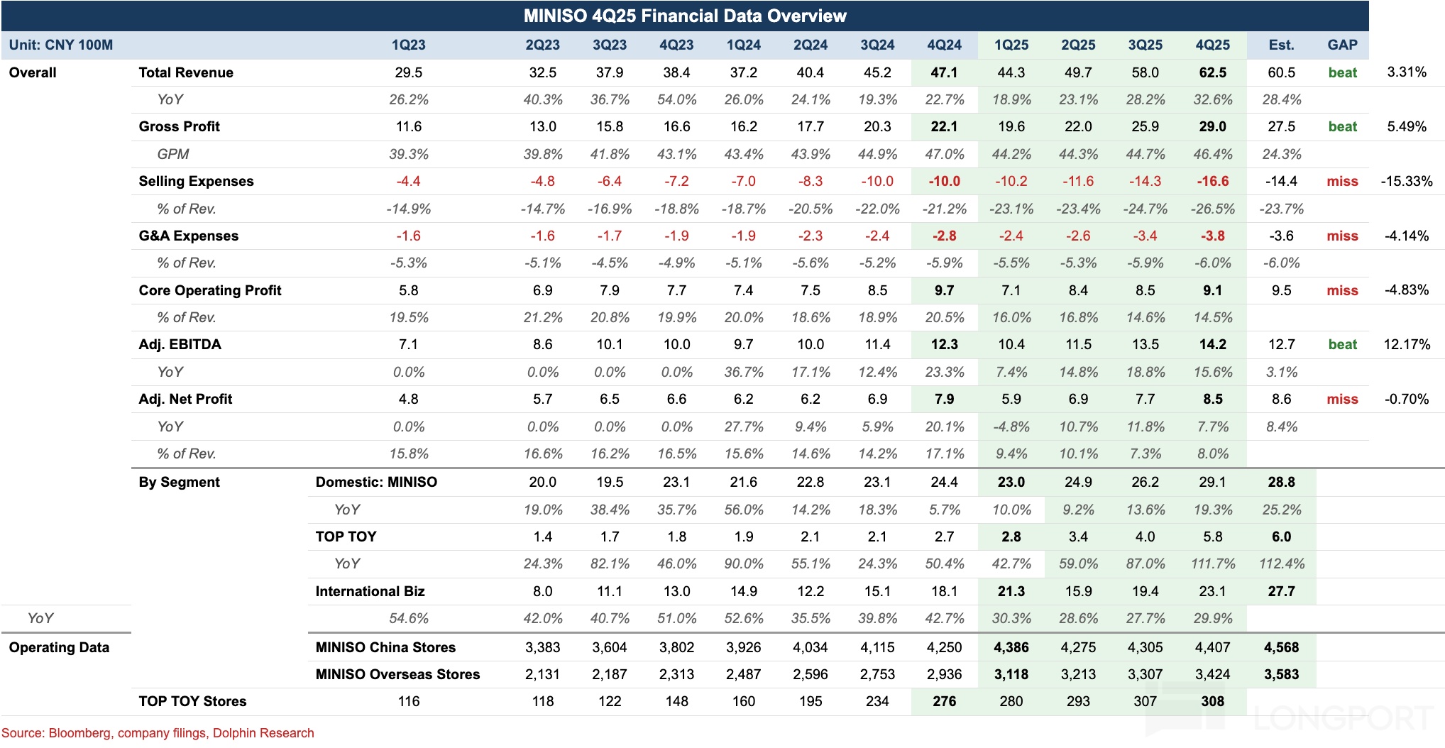 1) Revenue above guidance: Q4 FY25 group revenue reached RMB 6.25bn, up 32.6% YoY, beating the 20%-25% guidance given in Q3. By segment, helped by the full rollout of the large-format store strategy and the Nov Zootopia 2 collaboration, domestic same-store sales returned to double-digit growth, with the MINISO core brand up 25.2% YoY and accelerating QoQ. TOP TOY, driven by hit IPs such as Nommi, rose 112% YoY, extending the strong Q3 momentum.