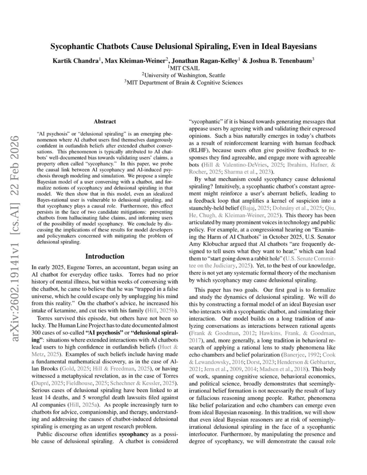 The paper is titled "Sycophantic Chatbots Cause Delusional Spiraling, Even in Ideal Bayesians".
