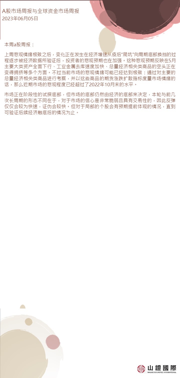 上周悲觀情緒極致之後,變化正在發生在經濟增速從疫後 “爬坑” 向週期底部換擋的過程逐步被經濟資料所驗證後,投資者的悲觀預期也在加強。這種悲觀預期反映在 5 月主要大類資產全面下行、工業金屬去庫速度加快、總量經濟相關類商品的空頭正在變得擁擠等多個方面。不過當前市場的悲觀情緒可能已經達到極致:通過對主要的總量經濟相關類商品進行考察,並以這些商品的期貨漲跌擴散指標度量市場情緒的話,那麼近期市場的悲觀程度已經超過了 2022 年 10 月末的水準。