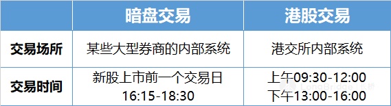 暗盘只有在港股上市前一个交易日的 16:15-18:30 时段进行交易。暗盘交易和新股上市后的正常交易在操作上是没有区别的。我想,如果非说出什么不同的话,可能就是交易量上的区别了。暗盘的交易量少,上市后的交易量多。