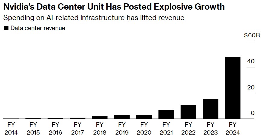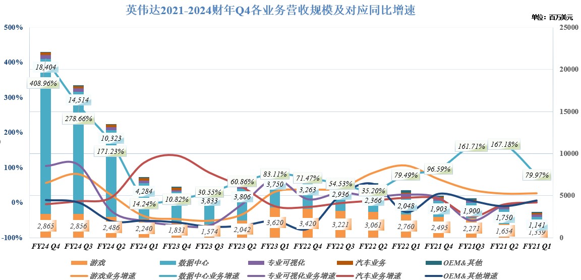随着全球迈入 AI 时代,数据中心业务已经成为英伟达最核心业务,而不是此前重度依赖游戏显卡需求的游戏业务。英伟达在细分业务方面,英伟达为全球数据中心提供 A100/H100 芯片的业务部门——数据中心业务部门,曾经可谓是英伟达 “副业”(自英伟达创立之处,游戏业务一直是英伟达的最重要业务),已经成为该科技巨头整体营收的最强大贡献力量。