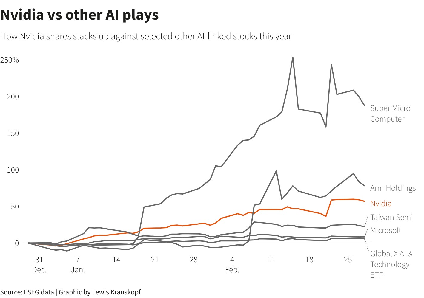 NEW YORK, March 1 (Reuters) - Money managers are scrambling to cash in on the stock market’s interest in artificial intelligence, as a stunning rally by Nvidia (NVDA.O) sparks a search for other companies that are capitalizing on the technology.