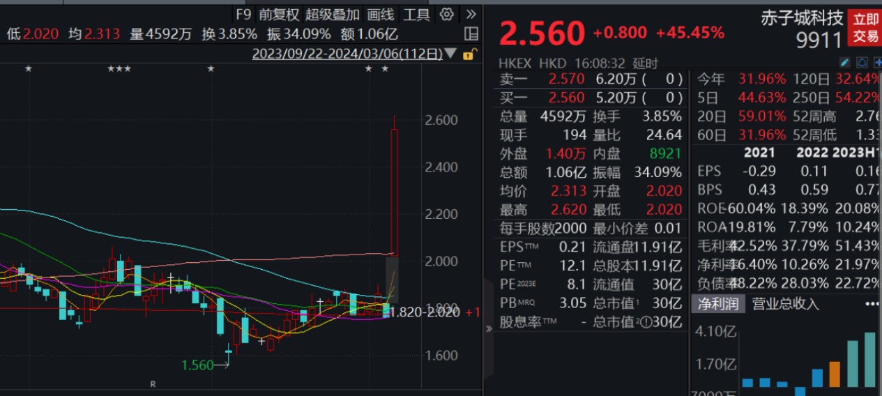 本月初,在發佈盈利預告次日,赤子城盤中一度漲近 50%,成交量放大至 1.06 億港元,獲市場資金搶籌。