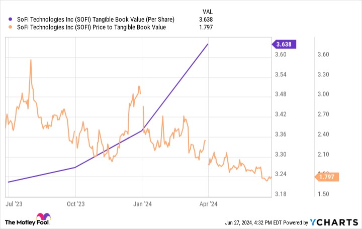 與此同時,不斷增長的賬面價值和下跌的股價終於使 SoFi 成為比 摩根大通 等成熟藍籌銀行更便宜的股票,後者目前的交易價格約為其賬面價值的 2.3 倍。