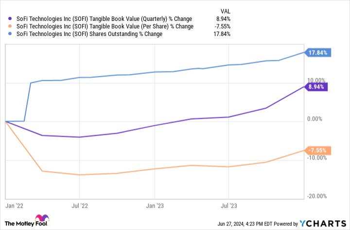 在 2022 年和 2023 年,SoFi 大幅增加了股份數量,這超過了公司在總賬面價值上的增長: