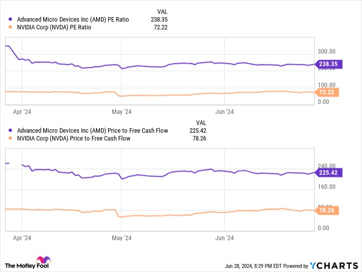 英偉達和超威半導體在其人工智能之旅中處於不同的階段 -- 一家公司主導市場,另一家公司仍在努力找到立足點。通常,這種類型的對比意味着劣勢方在長期內有更多的增長空間。然而,儘管超威半導體的盈利表現平平,但其股價已經大幅增長。這使得超威半導體的股價被嚴重高估。