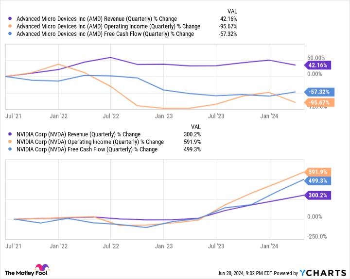 此外,考慮這些公司在過去三年中財務增長的巨大差異。英偉達的營收、營業收入和自由現金流均實現了三位數增長。與此同時,超威半導體的營業收入和自由現金流大幅下滑,因此其在業務和在人工智能領域競爭方面的投資將會受到更少的財務資源支持。
