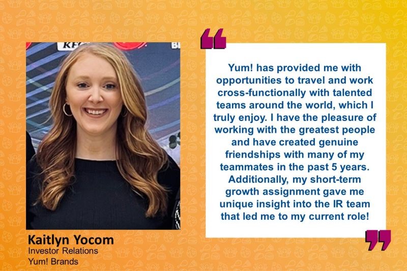 During her STA, she supported the earnings preparation process, including briefing materials for Yum!'s leadership team. This growth opportunity gave her the unique insight into the important work the IR team does and she ultimately joined the team a few months later in 2021. She says she is grateful that she took the leap to learn more about a new department because it brought her to her current role. Kaitlyn - kudos to you for all your growth at Yum!