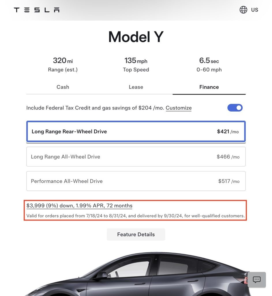 對於符合條件的 Model 3 和 Model Y 車型,1.99% 年利率優惠適用於最長為 72 個月的融資計劃。查看 Model 3 和 Model Y 的訂單頁面顯示,如果客户選擇特斯拉最長的融資期限 84 個月,他們將獲得 3.99% 的年利率。