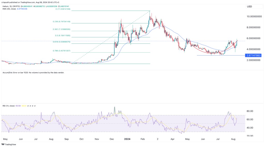 Helium 已經突破了 50 日移動平均線和 61.8% 的斐波那契回撤點。它還形成了一個杯柄圖表模式,這是一個常見的看漲信號。其最近的回調是杯柄部分的一部分。