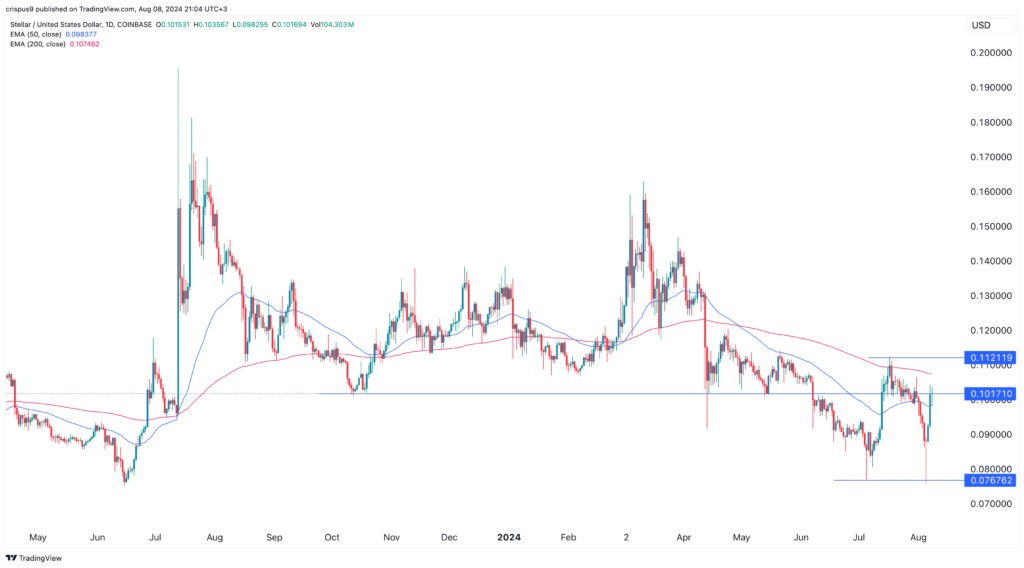 恆星代幣也處於 50 日和 200 日指數移動平均線之間。它還形成了一根蜻蜓十字星蠟燭圖案。