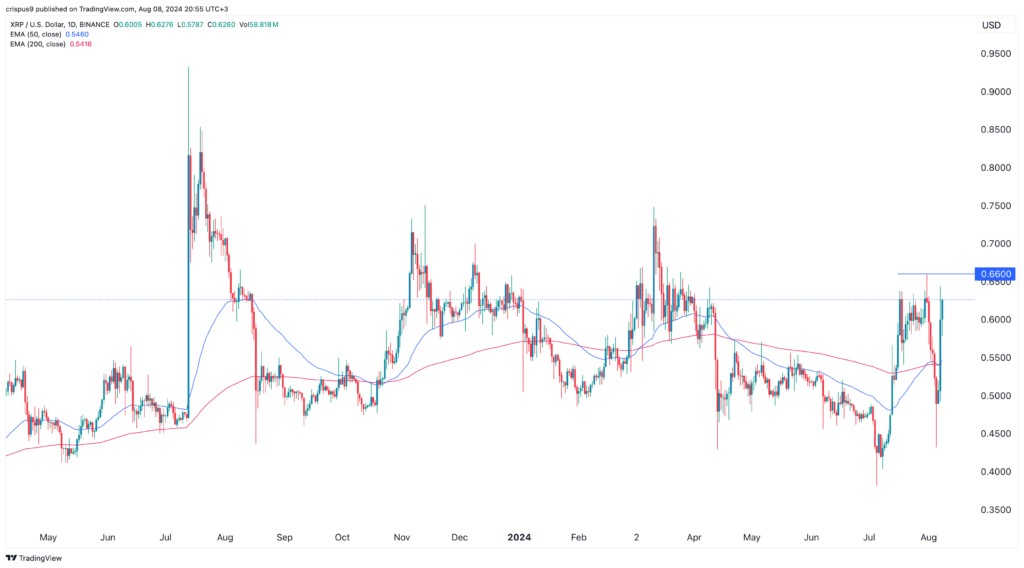 然而,有跡象表明 XRP 價格在 0.6600 美元處找到了實質性的阻力點,這是其 7 月 31 日的最高點。因此,該代幣需要突破該水平以確認更多上漲。如果發生這種情況,下一個關注點將是 0.70 美元。