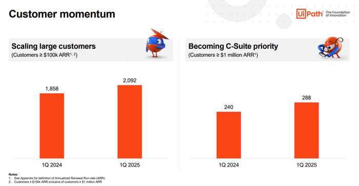 UiPath's stock was in a slow recovery mode through much of 2023 and into 2024. However, the stock took a significant fall after it delivered its latest earnings report in late May. Management lowered its full-year annual recurring revenue (ARR) guidance from $1.73 billion to $1.66 billion. A 4% guidance cut may not seem significant, but any guidance cut is significant for growing tech companies (companies tend to guide for easily reachable targets so they can beat them). Even more concerning, management lowered its full-year revenue guidance by 10% from $1.56 billion to $1.41 billion. With a dollar-based net retention rate of 118% (its existing customers spent 18% more than they had in the prior year), the downgraded revenue target indicates that it lost customers.