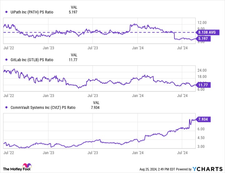 The stock's valuation of about 5.2 times sales reflects the immense challenges UiPath faces. That price-to-sales (P/S) ratio is less than two-thirds of its recent average and lower than peers. For instance, Gitlab and CommVault Systems trade at significantly higher valuations.