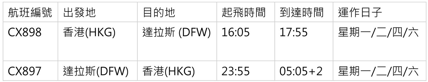 Currently, CATHAY PAC AIR operates 88 round-trip flights per week to and from Boston, Chicago, Los Angeles, New York, San Francisco, Toronto, and Vancouver in North America; the new service with four weekly round-trip flights to Dallas will be operated by the latest Airbus A350-1000 aircraft, further enhancing the North American route network. The new route is now open for booking, with flight schedules as follows (all local time, subject to relevant approvals):