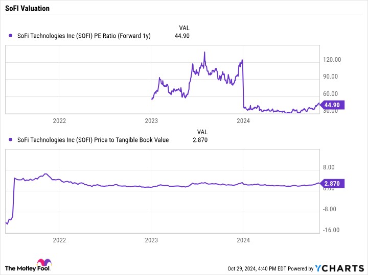 以 45 倍的前瞻市盈率(P/E)和約 2.6 倍的市淨率(P/TBV)來看,SoFi 在傳統指標上並不便宜。然而,該公司正在強勁增長,其信用質量也有所改善。