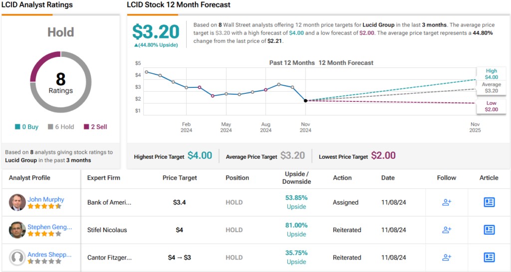 Among Gengaro’s peers, 2 analysts recommend selling, while 5 join him on the fence, resulting in a Hold consensus rating. The average price target of $3.20 suggests most analysts believe the stock is undervalued, projecting a 12-month upside of 44%. (See Lucid stock forecast)