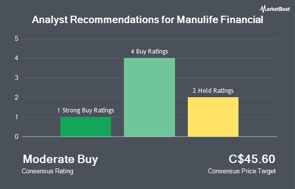Shares of Manulife Financial Co. (TSE:MFC - Get Free Report) NYSE: MFC have been given an average rating of "Moderate Buy" by the seven ratings firms that are covering the firm, MarketBeat.com reports. Two equities research analysts have rated the stock with a hold recommendation, four have given a buy recommendation and one has issued a strong buy recommendation on the company. The average twelve-month price objective among brokers that have updated their coverage on the stock in the last year is C$45.60.