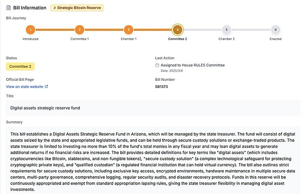 The process for state governments in the United States to establish strategic Bitcoin reserve bills generally requires: first, state legislators or committees draft and submit them to the state legislature; then vote on the House of Representatives and the Senate of the state legislature; finally, if both houses of the state legislature pass it, it will be sent to the governor for signature.