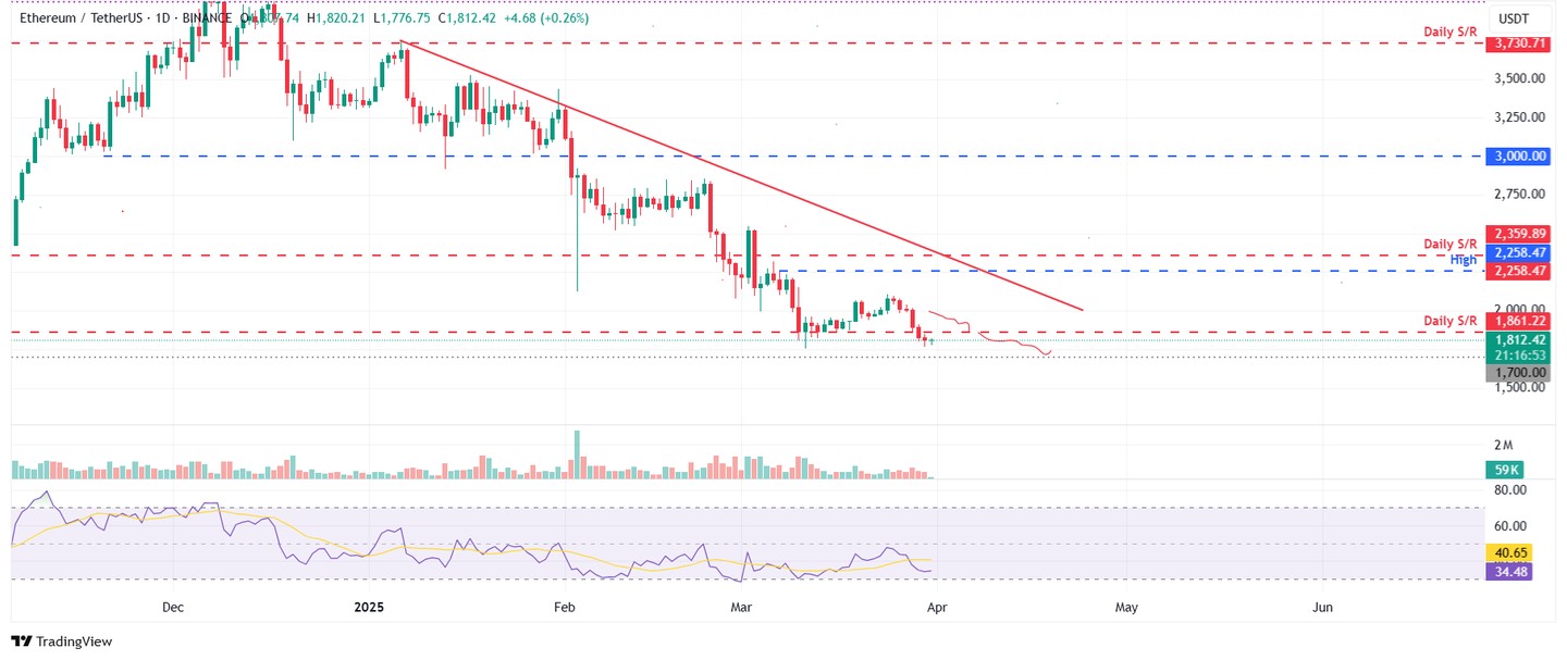 如果 ETH 继续其下行趋势,可能会延续下跌,重新测试其重要心理水平 1700 美元。