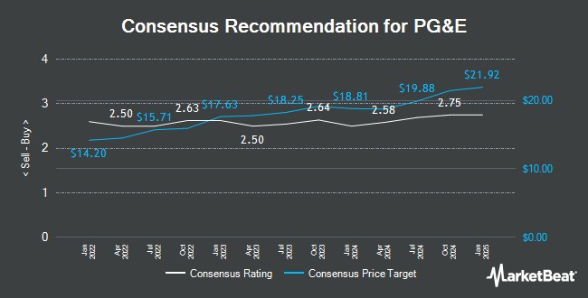 其他幾位股票分析師最近也對 PCG 發表了評論。BMO 資本市場在 2 月 18 日的研究報告中將太平洋煤氣與電力的目標價格從 21.00 美元上調至 23.00 美元,並給予該股票 “跑贏大盤” 評級。瑞銀集團在 3 月 19 日的研究報告中將太平洋煤氣與電力的股票評級從 “買入” 下調至 “中性”,並將該公司的目標價格從 22.00 美元下調至 19.00 美元。摩根大通在 2 月 12 日的研究報告中重申了 “增持” 評級,並將太平洋煤氣與電力的目標價格設定為 22.00 美元。摩根士丹利在 3 月 20 日的研究報告中將太平洋煤氣與電力的目標價格從 16.50 美元上調至 17.50 美元,並給予該公司 “減持” 評級。最後,古根海姆在 2 月 18 日的報告中將太平洋煤氣與電力的股票評級從 “買入” 下調至 “中性”。一位研究分析師對該股票給予了賣出評級,兩位給予了持有評級,九位給予了買入評級。根據 MarketBeat 的數據,太平洋煤氣與電力目前的平均評級為 “適度買入”,共識目標價格為 21.95 美元。