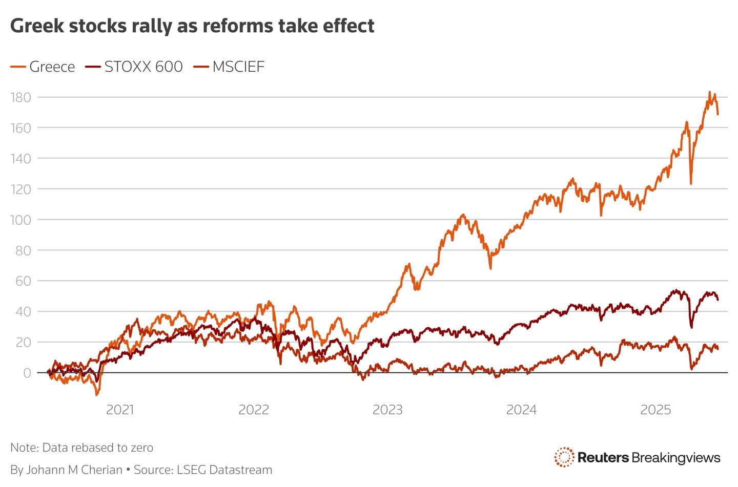 自 2021 年以來,雅典股票(.ATG)上漲超過 100%,並且在今年迄今為止表現優於歐洲的 STOXX 600(.STOXX)和更廣泛的 MSCI 新興市場股票指數(.MSCIEF)。
