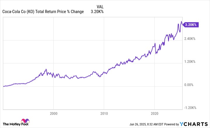 在深入細節之前,先簡單説明一下為什麼投資者常常向巴菲特尋求建議。作為董事長,他引導伯克希爾哈撒韋自 1965 年以來實現了近 20% 的年複合增長率,而 標準普爾 500 指數 則僅增長了 10%。巴菲特通過投資於合理或甚至便宜估值的優質公司,並持有多年,達成了這一目標。他策略的完美例子是他在 1980 年代末決定購買 可口可樂(KO 1.39%)。