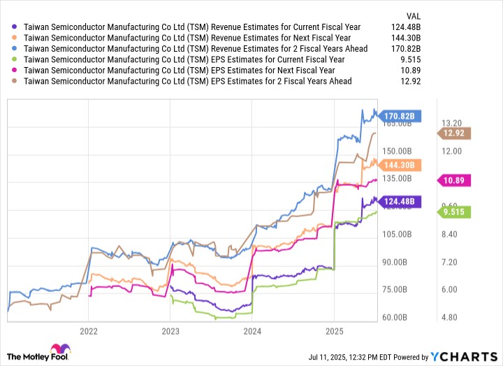 這些長期趨勢對台積電都是利好,因為對芯片的需求上升直接推動了公司的代工業務。根據上述數據,華爾街分析師預計,台積電在未來幾年將繼續實現收入和盈利的加速增長,因為公司尋求利用基礎設施支出的上升。
