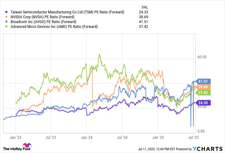 以 24.3 的前瞻市盈率(P/E)來看,台積電的交易價格相較於許多其他領先芯片股票而言具有相當大的折扣。有點諷刺的是,像英偉達、AMD 和博通這樣的公司在很大程度上依賴於台積電的服務,但市場卻對這些企業給予了高於台積電的溢價。