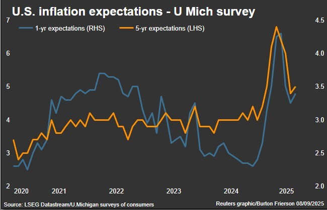 A New York Fed survey on Monday showed consumers’ one-year outlook rose to 3.2% in August from 3.1% in July, while the three- and five-year forecasts were unchanged at 3% and 2.9%, respectively. The University of Michigan’s latest one- and five-year forecasts are 4.8% and 3.5%.