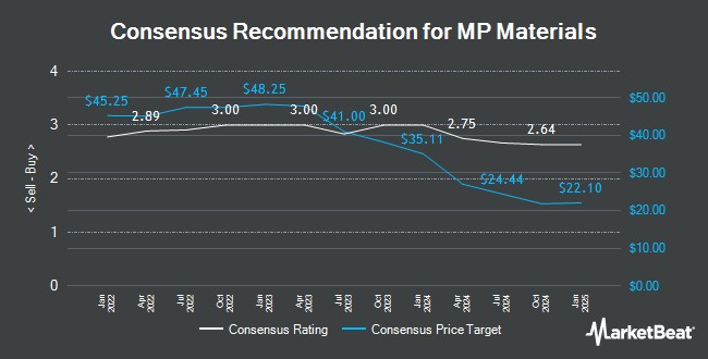 其他股票研究分析師也對該公司發佈了研究報告。華爾街 Zen 在 7 月 26 日的研究報告中將 MP Materials 的評級從 “賣出” 上調至 “持有”。Benchmark 在 8 月 29 日的研究報告中重申了對 MP Materials 股票的 “買入” 評級。Canaccord Genuity Group 在 8 月 8 日的研究報告中將 MP Materials 的目標價從 64.00 美元上調至 77.00 美元,並給予該股票 “買入” 評級。摩根大通在 7 月 21 日的研究報告中將 MP Materials 的目標價從 18.00 美元上調至 64.00 美元,並給予該股票 “中性” 評級。最後,Weiss Ratings 在週三的研究報告中重申了對 MP Materials 股票的 “賣出(d-)” 評級。一位股票研究分析師給予該股票 “強烈買入” 評級,七位給予 “買入” 評級,四位給予 “持有” 評級,一位給予 “賣出” 評級。根據 MarketBeat 的數據,該股票目前的平均評級為 “適度買入”,共識目標價為 74.00 美元。