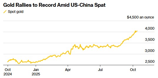 由於特朗普關税言辭緩和,美國股指期貨大幅上漲,標普 500 和納斯達克 100 指數合約漲幅超過 1%。與此同時,白銀和黃金價格因市場避險需求飆升,白銀價格上漲 1.1% 至每盎司 51 美元,黃金價格創下新高,達到每盎司 4060 美元。市場對貿易緊張局勢的反應導致貴金屬價格大幅上漲,風險資產則受到衝擊。