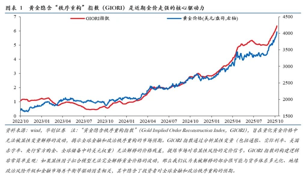 今天我想重點分享的是我們的最新研究。在 2025 年 5 月發佈的報告中,我們構建了黃金隱含 “秩序重構” 指數,我們希望解決一個關鍵問題:黃金價格的傳統顯性影響變量,如實際利率、通脹預期、美元指數及全球央行購金等,這些都是市場耳熟能詳的因子,但這些顯性因子,難以解釋本輪黃金的大幅上漲。原因在於,這些因子在過去 30 年、20 年乃至 10 年間的邏輯十分清晰,投資者對其認知已較為充分,基於這些因子的定價體系已高度成熟,很難再形成額外的上漲驅動。因此,我們將這些傳統顯性因子從黃金價格中剝離後,剩餘的無法被解釋的部分,是黃金超越傳統因子的異常漲幅,我們將其定義為黃金的 “非常規動能”,即下圖所示的黃金隱含 “秩序重構” 指數。