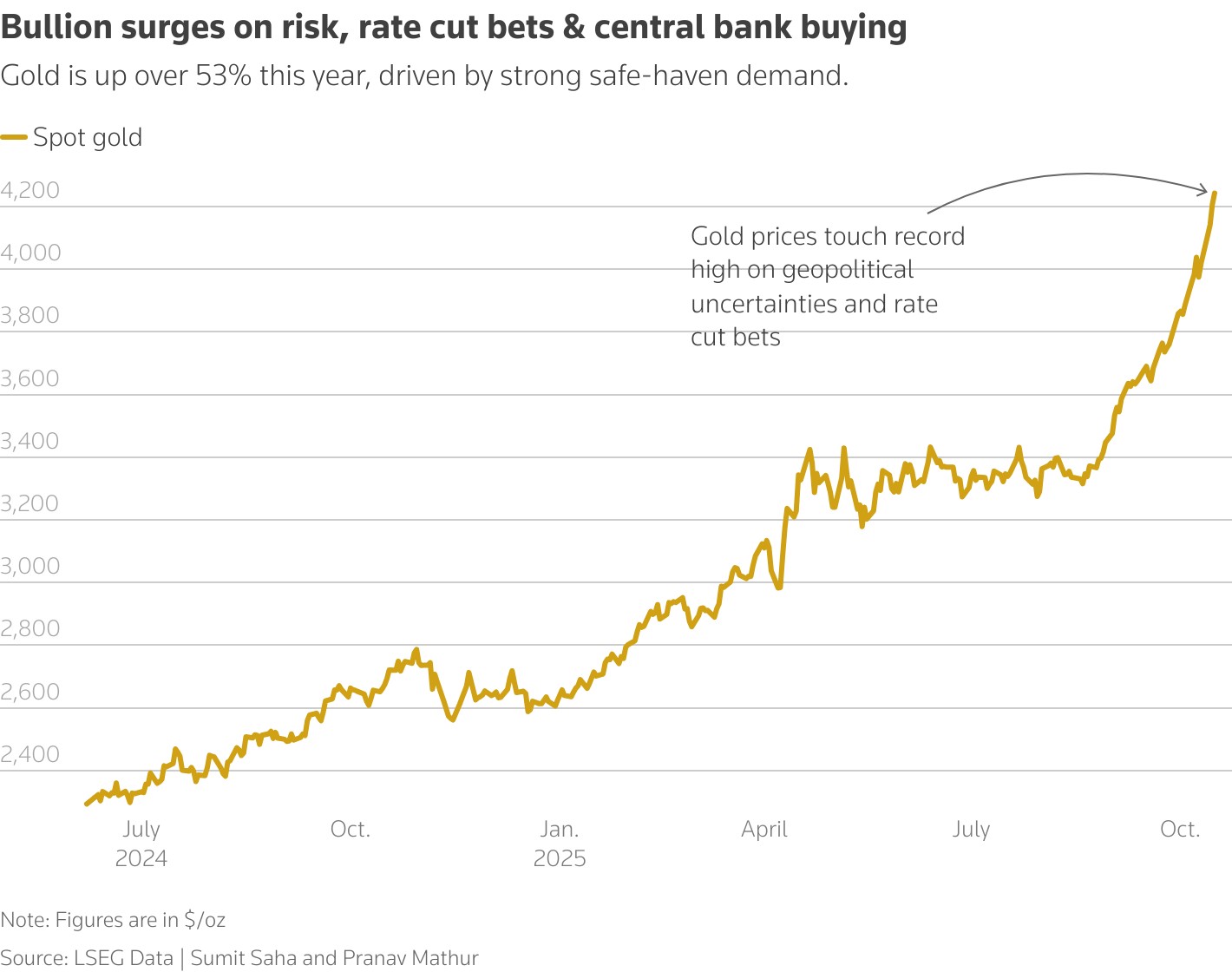 Gold hit a record high for the fourth straight session. The venerated safe-haven metal has gained over 60% year-to-date, driven by geopolitical tensions, aggressive rate-cut bets, central bank buying, de-dollarization and robust ETF inflows.