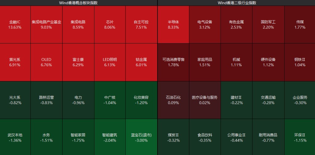 盤面上,半導體行業全線走強,華虹半導體漲超 13%,中芯國際漲 8%;有色、電氣設備行業漲勢不俗,洛陽鉬業漲超 6%;新能源車企逆勢下跌,蔚來跌逾 3%。