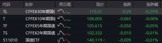 債市:國債期貨普遍下跌,截至收盤,30 年期主力合約跌 0.25%,10 年期主力合約跌 0.06%,5 年期主力合約跌 0.05%,2 年期主力合約跌 0.01%。