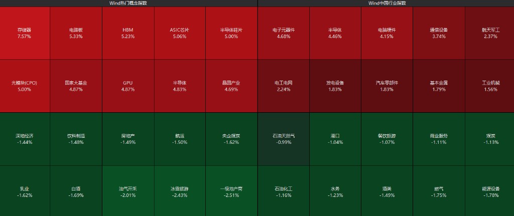 盤面上,個股漲多跌少,滬深京三市超 3000 股飄紅,今日全市場成交 1.99 萬億,滬深兩市成交額 1.97 萬億,較上一個交易日放量 3300 億。板塊方面,存儲芯片、商業航天、算力硬件、消費電子等板塊漲幅居前,煤炭、燃氣、地產、白酒板塊逆勢下跌。