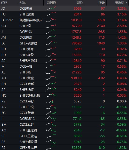 商品:國內商品期貨普漲,截至收盤,燃料油、雞蛋、集運歐線漲超 3%,國際銅、滬銅、原油漲超 2%,焦炭、焦煤、碳酸鋰、液化氣、滬錫漲超 1%;跌幅方面,紅棗跌超 4%,多晶硅跌超 1%。