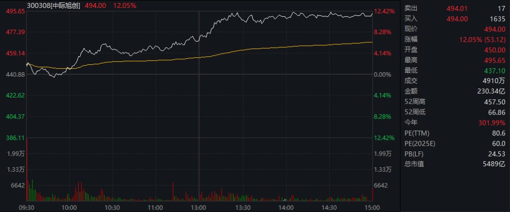 AI 硬件股爆發,寒武紀逼近歷史新高,中際旭創創新高